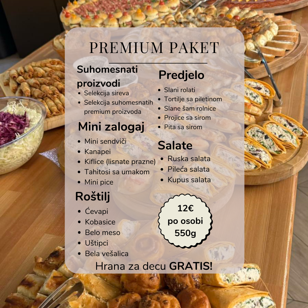 Partyboom nudi vrhunski ketering sa premium namirnicama, uključujući pažljivo birane sireve, suhomesnate delikatese, roštilj, sveže salate i mini zalogaje. Idealno za savršene dečije proslave, spcijalne i poslovne događaje. Sve je ručno pripremljeno za vrhunski gastronomski doživljaj!