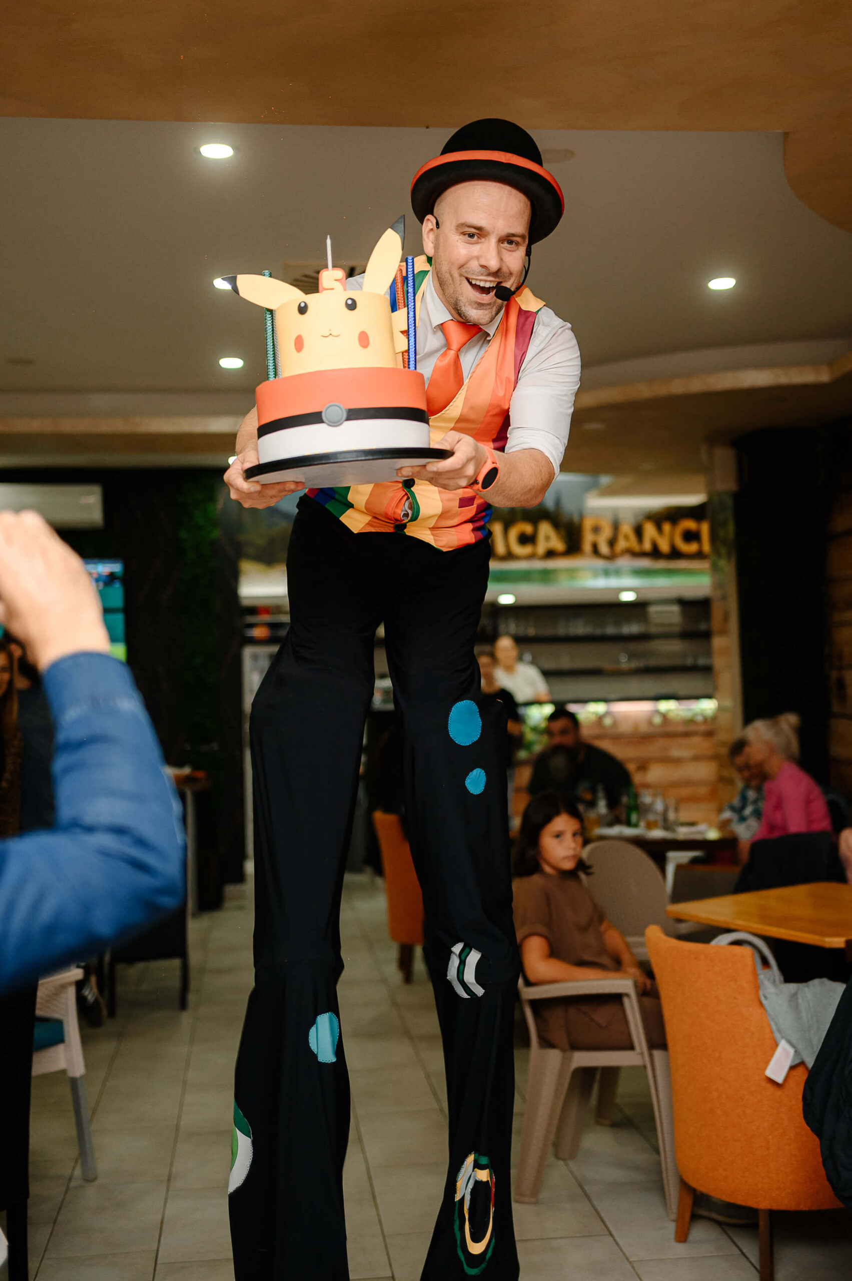Performans na štulama iz Partyboom-a donosi zapanjujuću vizuelnu atrakciju i interaktivnu zabavu za decu i odrasle. Izvođač Miki hoda na štulama i pojavljuje se kao veliki čarobni džin koji iznosi tortu, skače, podiže i ljulja malu publiku, žonglira i – ukoliko je događaj na otvorenom – stvara velike, magične balone od sapunice. Predstava je osmišljena tako da kombinuje dramu, fizičku veštinu i interakciju, stvarajući trenutke koje deca dugo pamte.